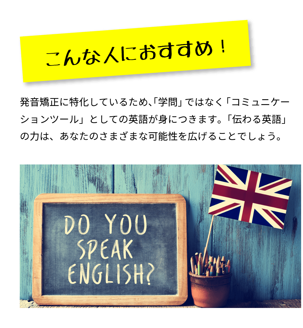 講師自身も学習にて後天的に身につけたからこそ「伝わる英語」のポイントである発声法とイントネーション、アクセントを的確に教えられる。そして外国人でありながら日本語が堪能で日本文化にも詳しいことから、日本人ならではの英語学習の弱点を客観的に把握し、それを克服させるスキルを持つ。