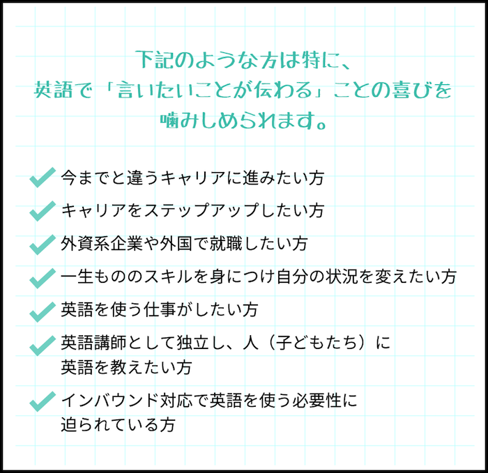 コミュケーションがうまくいく「伝わる英語」が身につきます。
